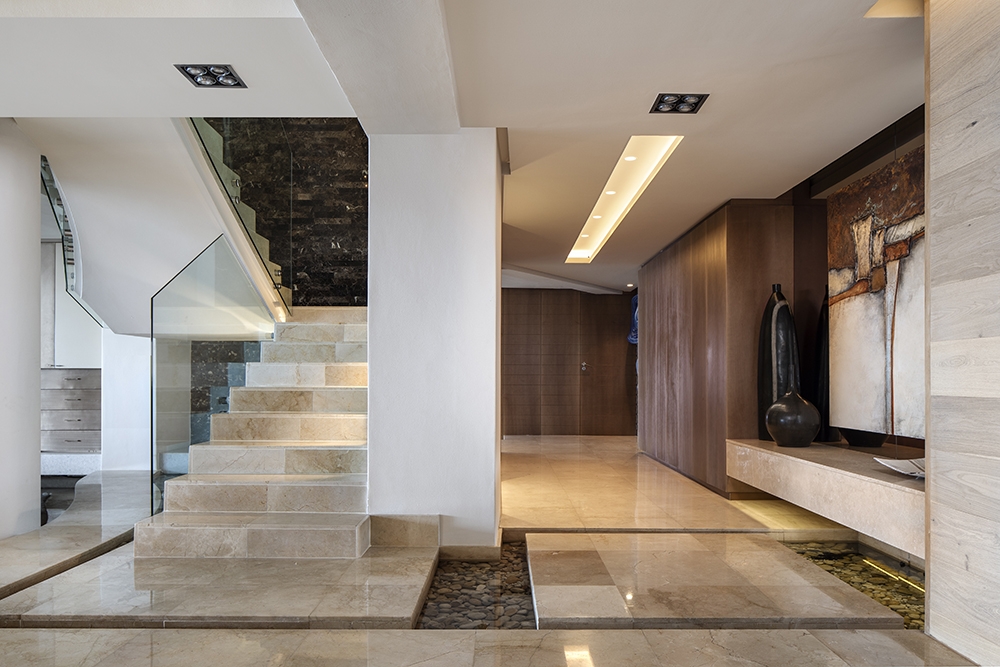 Bold, dramatic architectural features are met with the highest detailed finishes as well as custom made designer furniture throughout this luxurious penthouse apartment.